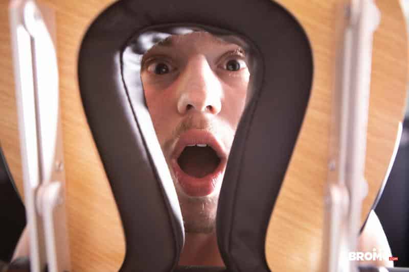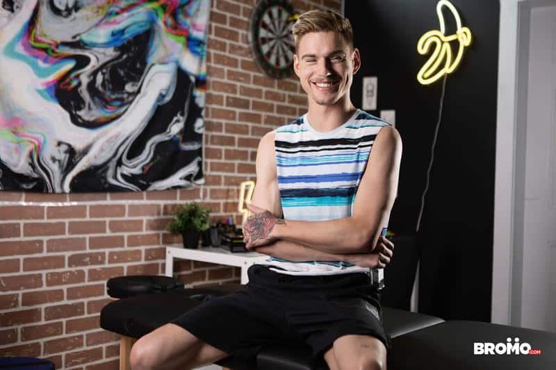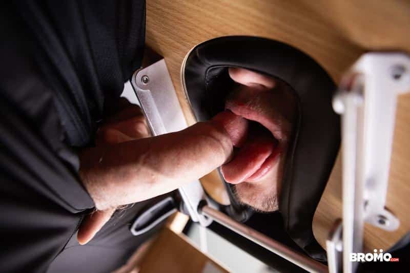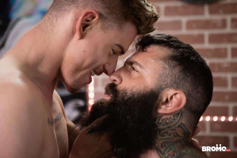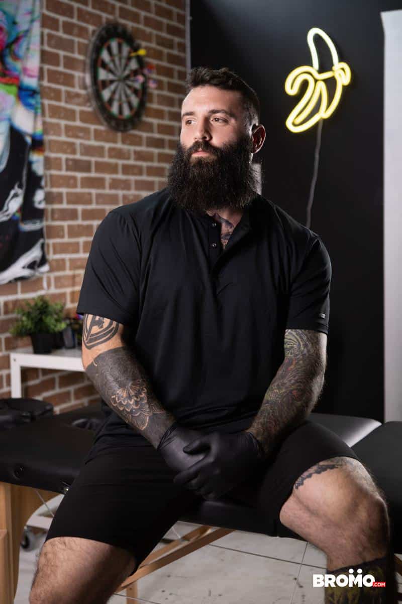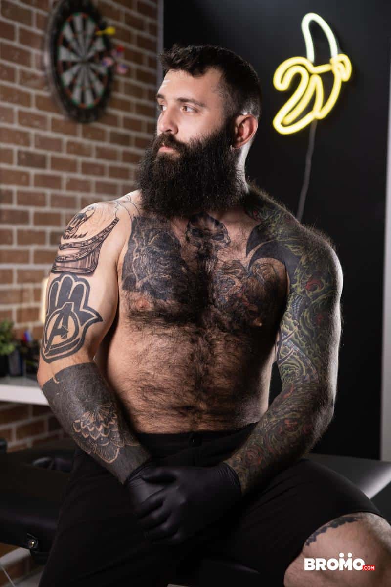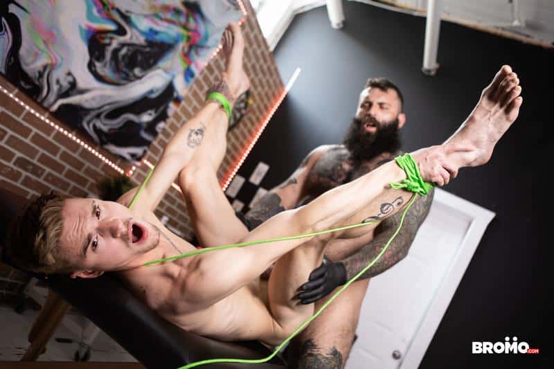 He pulls Markus’s cock out and sucks it, and the tattoo artist fucks the bottom’s face, then strips him and ties his wrists and ankles together with rope before penetrating his hole.