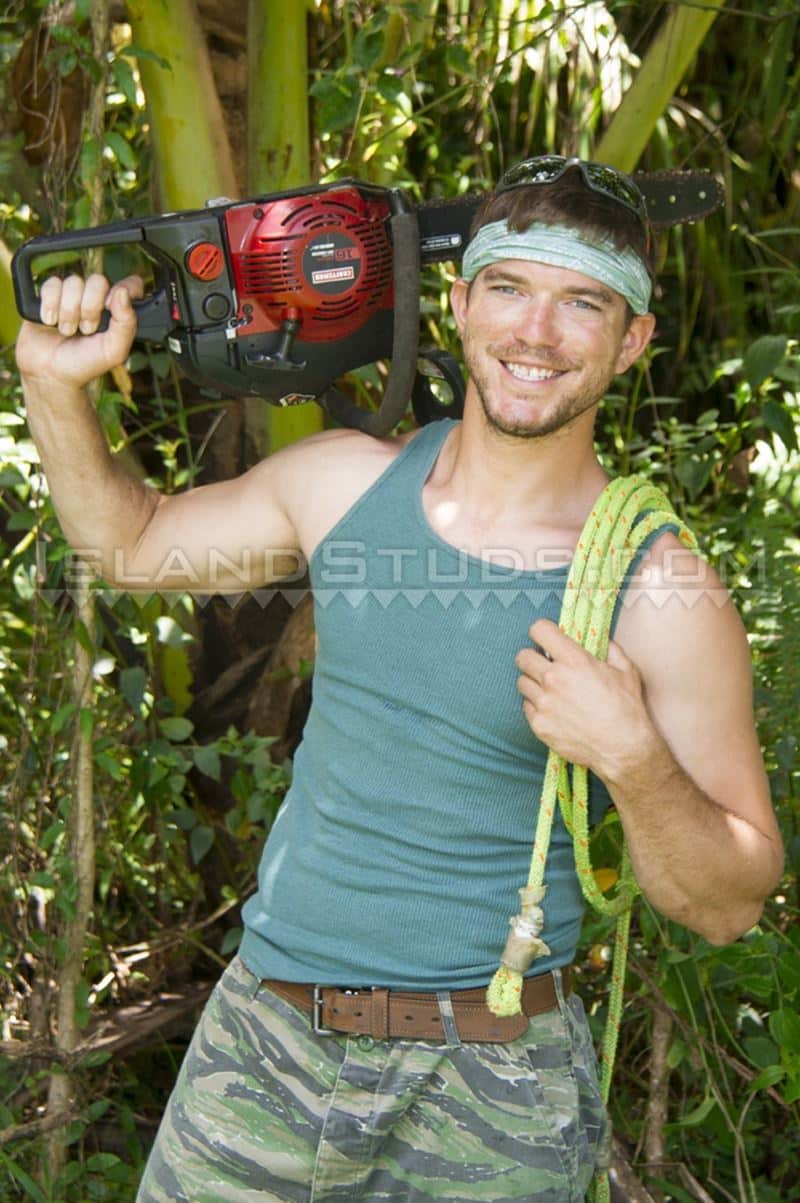 As he starts up his chainsaw and then climbs a tall 60-foot tree wearing only his saddle and spikes on his boots in a fully erotic nude rock hard and dangerous tree trimming session in a Hawaiian forest.